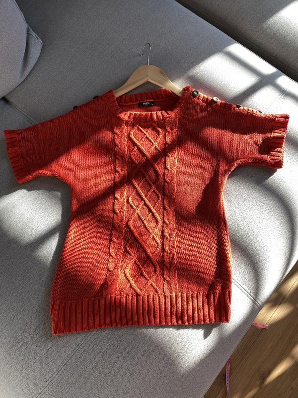 Продам свитер с коротким рукавом тонкая вязка цвет красный на рукавах пуговицы подойдёт на размер 46 длина 61 грудь 46 длина рукава 16