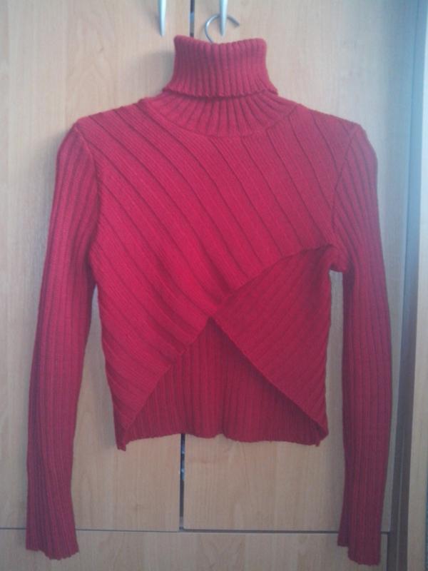 Ооочень красивый тёпленький оригинальный с мериносовой шерстью свитерок с двойным воротником-стойкой, вишнёвого цвета. Размер 42-44, замеры: длина по центру спинки - 46 см, ОГ до 88 см, ОТ до 75 см, но спереди красивый вырез снизу на запах, длина рукава сверху 61 см, снизу 46 см, плечи - 40 см. Состав ткани: 70% акрил,30% мериносовая шерсть, хорошо тянется. Made in MADRID, фирма - Picasso. Пожалуйста, пишите, звоните, интересуйтеся:-)...