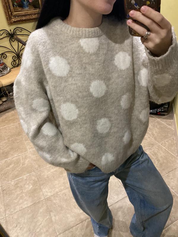 Светр від пулла, розмір М. (вдягнуто на: 1.62 зріст, звичайний розмір с-м) Тобто він підійде і на С і на М і на Л, бо іде як оверсайз. Склад: 65% акріл, 31% нейлон, 4% еластан. Дуууже м’який до тіла, пухнастий.