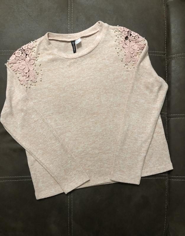 Теплая кофточка нежно персикового цвета с кружевными плечами от бренда Н&М. Идет свободного кроя. Размер М подойдет и на L.