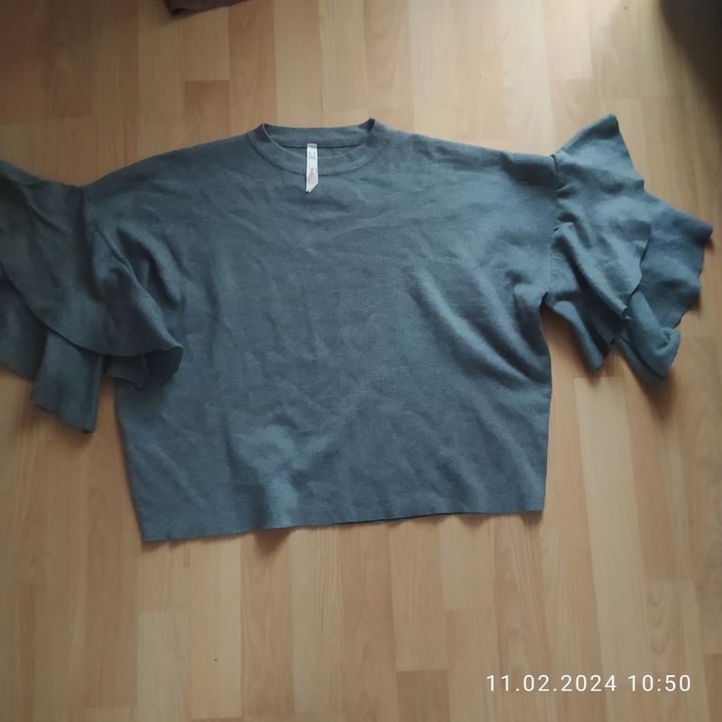 симпатичный свитер с рукавами воланами . Хорошего качества , длина чуть ниже талии . ткань хорошо тянется , в отличном состоянии. Пог 69 см , тянется до 80, длина рукава от шеи 48 см , длина свитера 53 см