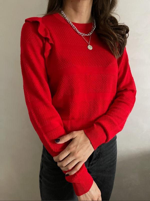 Очень красивый свитер с воланами Lindex Без бирки Фактурная ткань , очень мягкая и приятная к телу , 50% вискоза , 50% полиэстер Размер подойдёт на М/ L ПОГ: 47 - 48 см , тянется до 55 см Длина: 60 см, длина рукавов: 63 см.