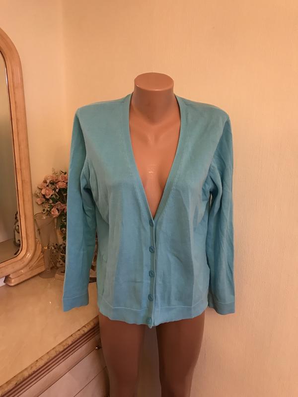 Кофта бирюзового цвета с длинным рукавом,спереди застегивается на пуговицы.Ткань натуральная-100% коттон, мягкая, приятная на ощупь, немного тянется. Длина - 59 см, ПОГ: 62-71 см., Рукав-63 см.