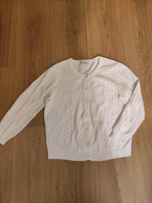 Кофта / свитер TU. в стиле "кежуал", белого цвета,чурное качество-тонкий 100% коттон, размер 46-48 в оригинале выглядит лучше, чем на фото, состояние идеальное, без дефектов, замеры :ПОГ 48 см,длина по спинке 48 см, длина рукава 3/4-50см, плечи 36 см.