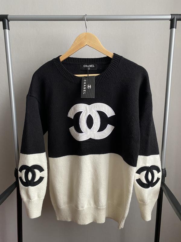 шерстяная кофта в стиле Chanel с крупными логотипами на груди и рукавах, в идеальном состоянии Замеры: плечи - 55 см рукав от плеча - 48 см ширина под руками - 52 см длина по спине - 65 см