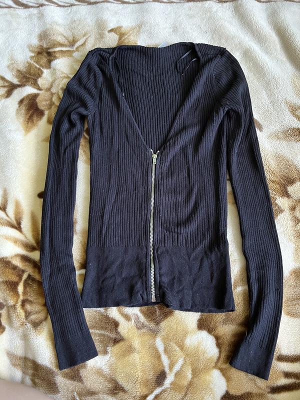 Черная облегающая кофта с декольте, на молнии подвижной. Текстура в рубчик. Фирма - H&M, размер xs.