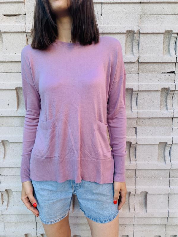Свитер тоненький, нежного фиолетового цвета, разрезы по бокам, с опущенными рукавами, приятная на ощупь. Вещь новая, с биркой. Рост модели 170 см.