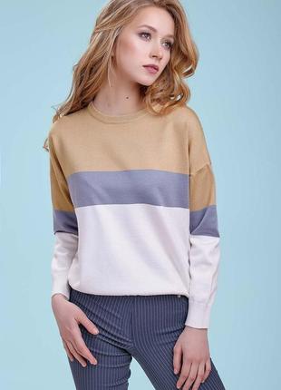 Молодіжний міський джемпер гуртом від виробника ST-Seventeen мінімалістично прикрашають горизонтальні смуги гармонійних між собою і досить популярних кольорів бежевий, сірий, молоко. Прямий вільний фасон за традицією має стильний вигляд і добре справляється із завданням приховати вади фігури в разі потреби. Високоякісне в'язання зроблене так, щоб джемпер комфортно було носити в весняний і літній сезони. Так що залишилося тільки додати ниточку усмішки на ваших устах і модний лук буде завершений.