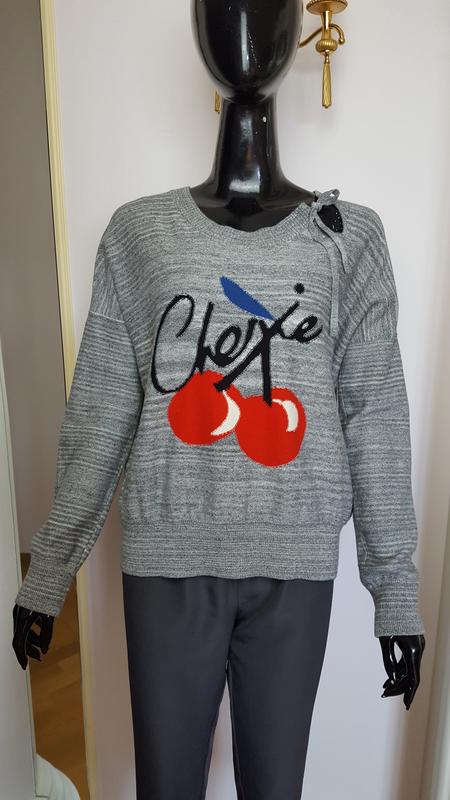 Свитер Sonia Rykiel. Стовідсоткова бавовна. Светр дуже гарний, стильний, із заниженою лінією плеча, з незвичайним вирізом горловини, з кидками та яскравими вишнями, за биркою розмір М.