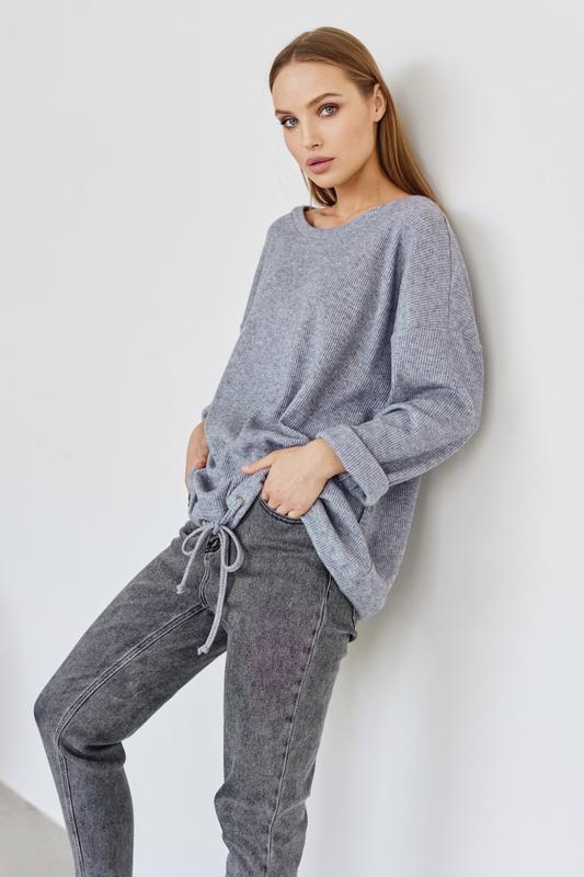 Джемпер идет свободного, прямого кроя. Плечо спущенное. Рукав длинный, приспущенный. Внизу джемпера есть шнурок, который можно завязать и немного изменить фасон.