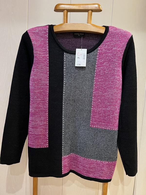 В наличии красивый свитерок фирмы ANNA ROSE. Размер указан XL, хорошо сядет и на 16. Состав: 76% вискоза, 15% полиестер и 9% metallic fibre, ткань мягкая и приятная к телу, хорошо тянется. Полуобъем в груди- 57 см и ещё тянется Длина- 66 см Плечи - 44 см Длина рукава- 61 см. Полуобъем в бедрах-58 см и ещё тянется