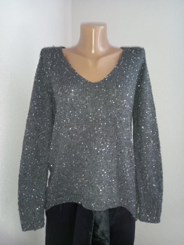 новый свитер угольно-серый в пайетке, тонкий,тянется.от высения на витрине есть немного вытянутые нити сзади, влияет на цену.трикотаж тендинтовательный,возможные зацепки при примерке поэтому пересылка только после оплаты.