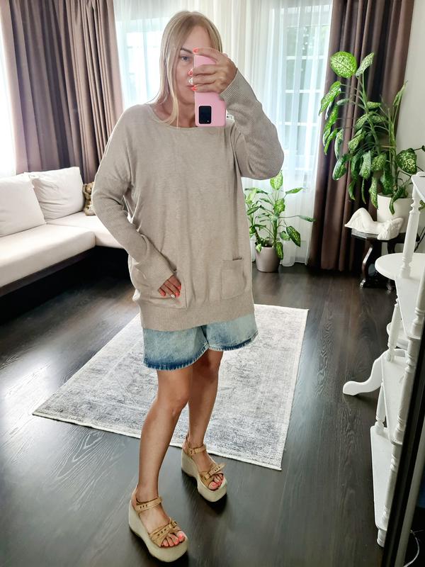 Свитер большого размера с кармашками Soyaconcept- Бежевого цвета! Вискоза- состав на фото- мягкий и приятный! Плечи занижены -- узкий рукав Между подмышками 66 см ( можно как оверсайз) Длина 74 см одет на размер М ( рост 160 см)