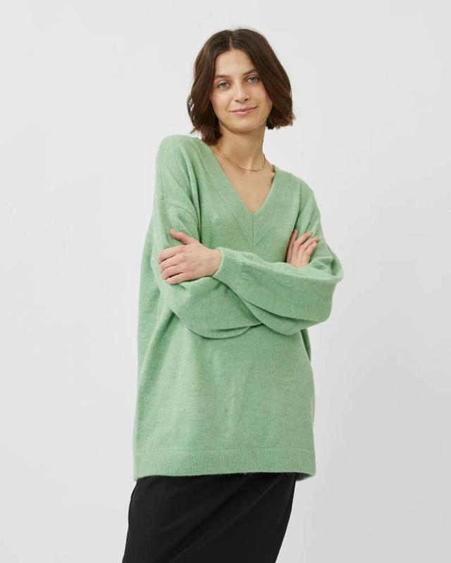 изготовлен из прозрачной, но теплой смеси шерсти, которая содержит шерсть альпаки и мериноса имеет свободный крой с спущенными плечами для повседневного образа с v-образным вырезом, широкими краями в рубчик и объемными рукавами с эластичными манжетами цвет: мятный