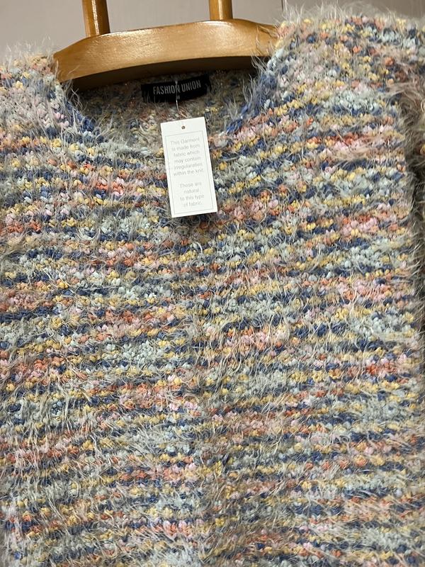 В наличии красивый свитер фирмы FASHION UNION. Размер указан M, но по замерам красивей сядет на 8. Состав: 40% нейлон и 60% полиестер, нитка очень мягкая и приятная к телу, хорошо тянется. Полуобъём в груди - 47 см. Длина - 53 см. Плечи приспущенные... Длина рукава от ворота - 60 см. Полуобъём в бедрах - 45 см и еще тянется