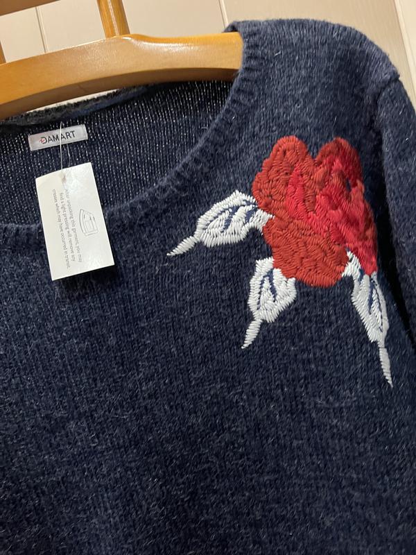 У наявності гарний светр фірми DAMART. Розмір вказаний 50/52 18/20. Склад: 55% акрил, 30% полімід, 8% мохер і 7% вовна, нитка тепла, добре тягнеться. Напівоб'єм у грудях — 65 см. Довжина — 65 см. Плечі — 54 см. Довжина рукава — 63 см. Напівоб'єм у стегнах — 65 см і ще тягнеться