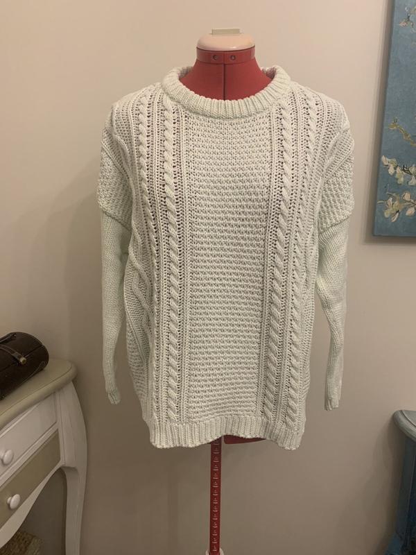 свитер MONKI, комфортный,нежно-мятного цвета, крупная вязка, из хлопка, over saiz, длина изделия 62 см, обьем груди 130 см, обьем низа 102 см, длина рукава 40 см, длина плеча 27 см( линия плеча занижена)