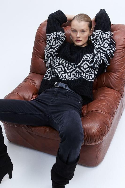 шикарный стильный свитер- Джемпер жаккардовой вязки с добавлением шерсти. Свободный крой с круглым вырезом, заниженной линией плеч и длинными рукавами с бахромой по плечевым швам. Ребристая резинка на манжетах и по нижнему краю. свободный крой 50% полиэстер, 45% акрил, 5% шерсть