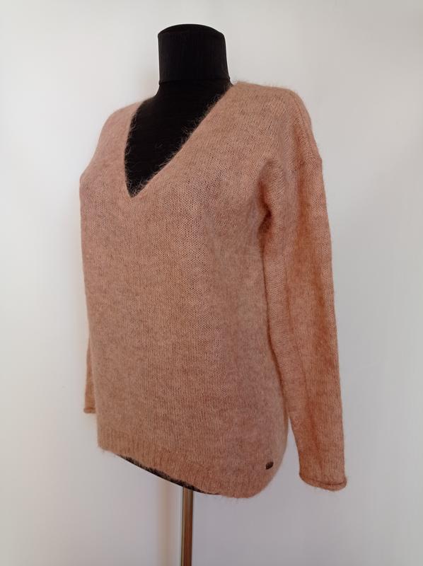 М'який, пухнастий, приємний на дотик, в складі альпака 53%, вовна 17%, стан ідеальний. Пог. 50, рукав від початку горловини плечико спущене 70, довжина спинки 66, перед 60.