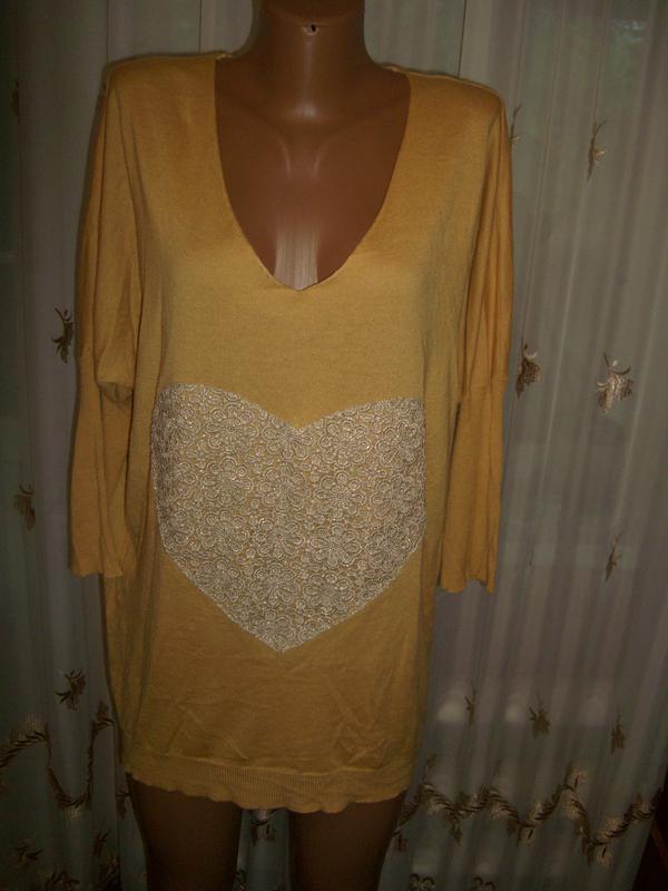 в'язаний светр гірчичного кольору, V-подібний виріз горловини, довгий рукав, звужений від ліктя, попереду декорований мереживним серцем, ззаду планка з гудзиками