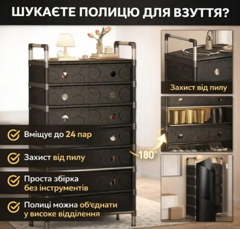 Напольная прямая 6-уровневая полка SKLM-32 – стильный и практичный стеллаж для обуви и аксессуаров Напольная прямая 6-уровневая полка SKLM-32 - универсальное решение для хранения обуви, одежды, аксессуаров, гигиенических и кухонных предметов. Высота 140 см и шесть просторных полок позволяют максимально эффективно организовать пространство даже в небольшой комнате. Черный минималистичный дизайн подходит для любого интерьера: прихожая, ванна, гардеробная или кухня. Металлическая рама из нержавеющего материала гарантирует надежность и долговечность, а пластиковые полки не деформируются, легко очищаются и не впитывают запахи. Преимущества: 6 уровней хранения для обуви, одежды и аксессуаров Прочная металлическая рама, устойчивая к нагрузкам Пластиковые полки, устойчивые к деформациям и влаге Легкая и мобильная конструкция, легко перемещать Быстрая сборка без инструментов Современный черный дизайн для любого интерьера Характеристики: Тип: наполная прямая полка Количество уровней: 6 Материал каркаса: нержавеющий металл Материал полок: прочный пластик Размеры: 140×63×28 см Цвет: черный Вес: легкий, удобный для переноса Стойкость: к влаге и ржавенице Назначение: обувь, одежда, аксессуары, кухонные и гигиенические предметы просьба уточнять наличие есть оплата при получении без предоплаты