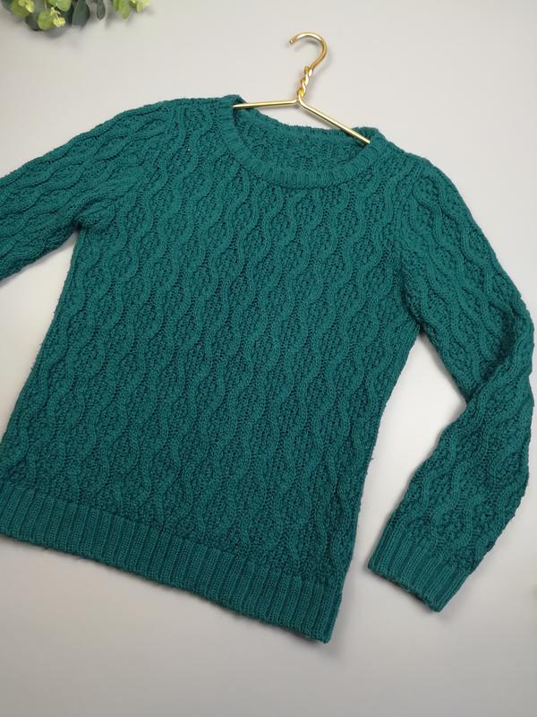 Теплий та зручний жіночий светр в насиченому смарагдовому кольорі крупної вязки. Джемпер має відкриту горловину, візерунок, низ на резинці, яка добре тягнеться. Склад - шерсть та бавовна. Светр підійде на різні розміри - від S до L, добре тягнеться та сідає по фігурі. Заміри: Напівобхват плечей - 38 см Напівобхват грудей - 50 см Напівобхват низу - 48 см Довжина - 60 см Довжина рукава - 61 см