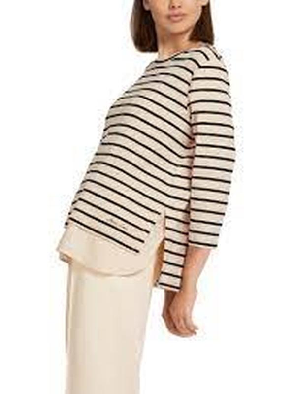 Лонгслів від бренда Marc Cain виготовлений із бавовни та еластану. Модель виконана у прямому крої. Має круглий виріз горловини, рукави завдовжки 3/4, бічні розрізи та принт у горизонтальну смужку Ціна на оф сайті 200 євро Бірка з розміром і складом відсутня. Заміри : Довжина від плеча ззаду 59см, спереду 63см. Довжина рукава від плеча 46см,плечі 40см,пог 52см