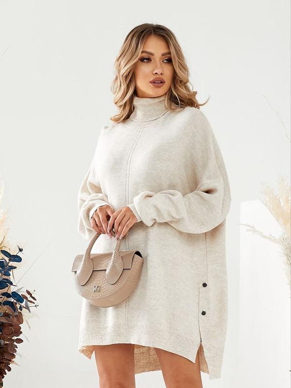 Свитер-туника в стиле оверсайз. Производитель Турция Модель - 6006. ф Состав: 50% шерсть 50% акрил. Качественная фабричная вязка. Размер оверсайз. ОГ от 132 см до 144 см. Длина спереди 75 см. Длина сзади по спине 80 см. Длина рукава от горловины 75 см. По бокам разрезы на кнопках. Кнопки не обманка. Глубина разреза 28см. Цвета: черный, голубой, светлый беж, малина.