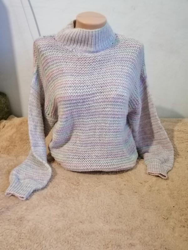 Красивый вязаный теплый свитер в хорошем состоянии имеет трашки затяжек, которые можно с легкостью затянуть в середину. Размер 48-52