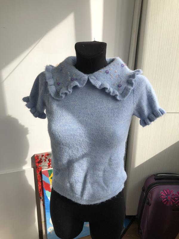 В идеальном состоянии, очень симпатичный и мягкий свитер с коротким рукавом нежно голубого цвета, фото не передает полностью. Размер с, подойдет на ЕС