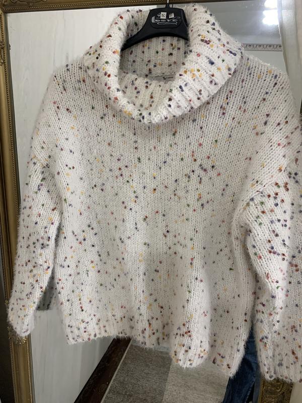 Прикольный свитерик, состояние нового! Размер указан 16, но красиво сядет на 12-14, смотрите замеры! Полиамид и полиэстер, тепленький, плотный, приятный к телу. Плечевой шов спущен, плечи 56, по груди 57, внизу 53, рукав 44, длина 62 см