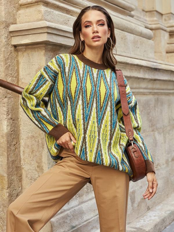 Светр дрібної в'язки з високоякісного турецького матеріалу. Горловина, манжети та низ виробу зв'язані гумкою. Декоровано ромбоподібним візерунком. На моделі представлений 44-50 розмір: - довжина виробу - см; - довжина рукава - см. Розтяжність: тягнеться (4-8 см) Колір: жовтий Стиль: в стилі кежуал Рукав: з довгим рукавом Візерунок: з принтом Тип: дрібної в'язки Фасон: оверсайз Сезон: тепла осінь/весна, холодна осінь/весна Подія: на прогулянку