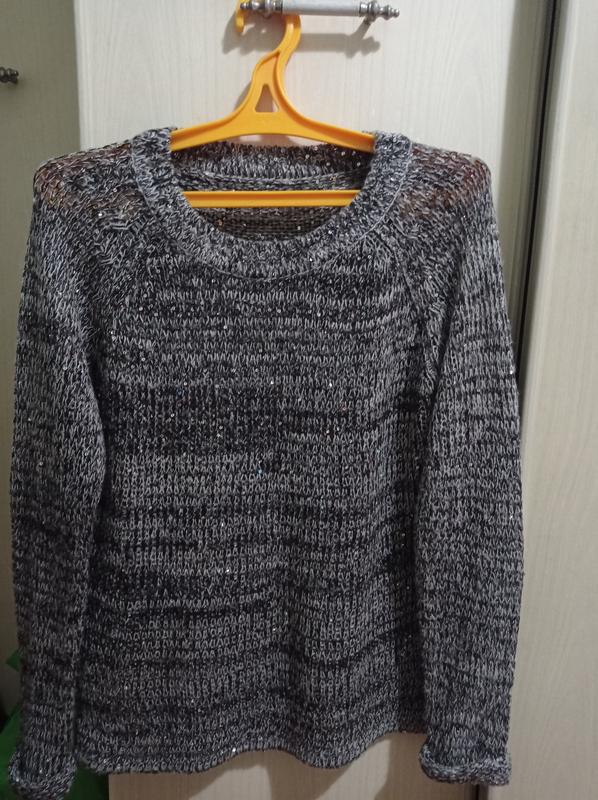 Свитер вязка, бело-серого цвета+люрекс+паетки, смотрится очень эффектно! Хорошо тянется, объем груди 57см., длина 65см.