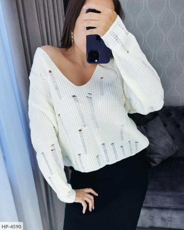 соСветр HP-4589 модель 6720 Размиры: 42-52 Производитель Турция Стильный свитер с актуальным дырочками в самых тончайших цветах: трава, беж, малинка, молоко и электрик Крой оверсайз, спущенное плечо, v-образный вырез горловины- все это делает этот свитер удобным и стильным одновременно Замеры, погрешность измерения +1см ОГ 60 см Длина -52 см Длина рукава от ворота-80 см