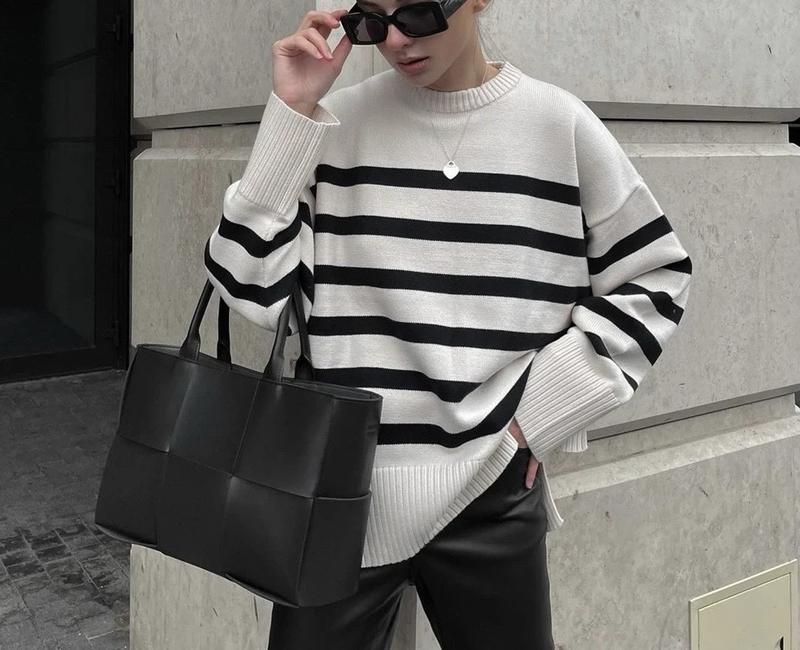 Стильний вʼязаний оверсайз светр в полоску Тканина акрил. Теплий і дуже приємний. Тканина гіпоалергенна. Розмір М Довжина без комірця 61 см Довжина рукава 53 см Напівобхват грудей 57 см Підійде на xs-m