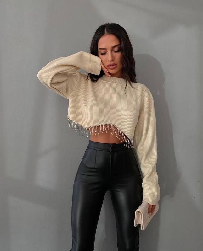 🎀 Кофта Размер: 42-46 Ткань: рубчик, высокого качества Цвета: светлый беж, черный Качество отличное Рукав на манжете, низ украшен металлической бахромой, сочетается с любым низом, юбкой, брюками, джинсами, под ваше настроение