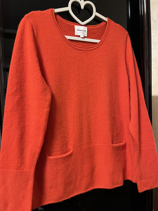Ніжний кашеміровий светр від французького бренду Maison. Відповідає розміру UK 14. Пог 48см, довжина 60см, довжина рукава 64см . Колір теракотовий до червоного. Стан ідеальний. Дод. фото, заміри надам.