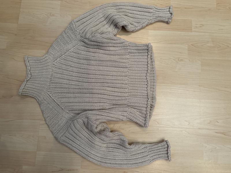 Свитер с мягкой пряжи в нежном бежевом оттенке.Ди 50,дл рук от горловины 69,ог 60,ширина по низу 45,высота горловины 12