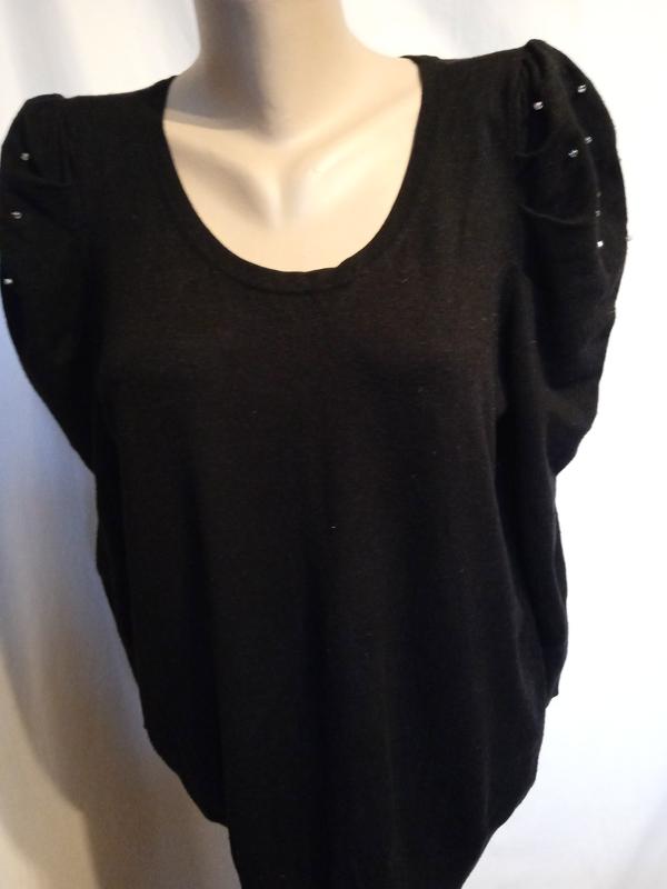 свитер имеет насыщенный черный цвет,свитер красивый,нарядный,здобленные рукава, длина65,пог50-52,рукав51, тканная вискоза84%,стан новой вещи