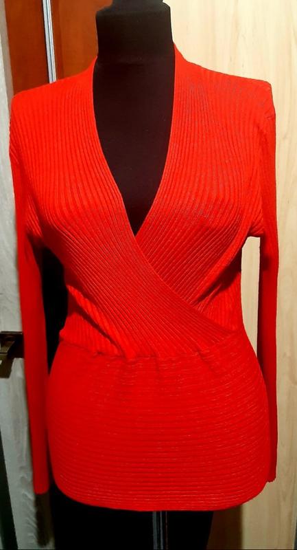 классный свитер с красивым декольте на запах, насыщенный красный цвет, красивое состояние и качество, шикарно сидит по фигуре, размер 48-50