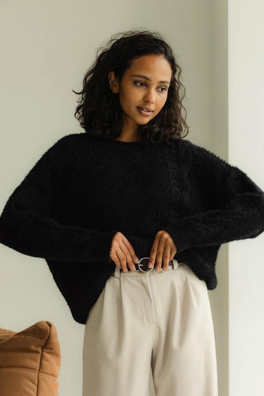 Материал - Ангора - 30%, Шерсть - 30%, Хлопок - 20%, Акрил - 20% - плотная высококачественная вязка Фасон - прямой, свободный Сезон - осень, зима, весна Конструктивные элементы - спущенное плечо Комплектация - джемпер Уход за одеждой - ручная стирка до 30° Длина изделия - UN=62 см Длина рукава - UN=69 см