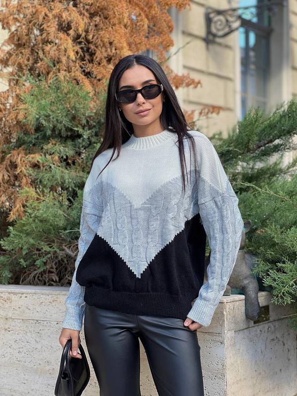 Светр Модель 5043 Склад: 30% акрил; 70% шерсть🧶🐏 Розмір: універсальний (42-50) Кольори: молоко-сірий-чорний, молоко-бузок-синій, молоко-сірий-джинс, сірий-джинс-синій, молоко-світла пудра-темна пудра Заміри виробу: - довжина виробу 68 см; - довжина рукава від горловини 72 см; - ширина 60-70 см