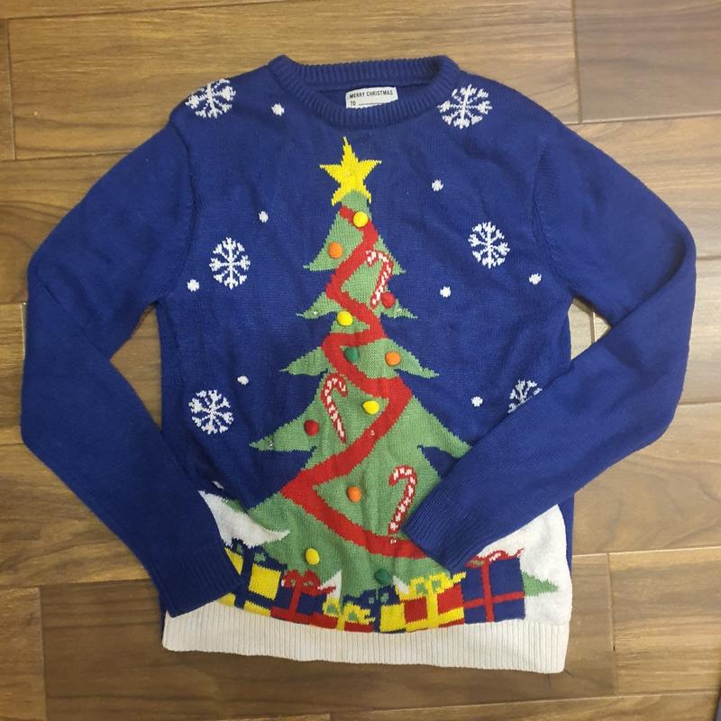 Яркий праздничный тёплый свитер.Имеет вшитые светодиодные огоньки, но сейчас не светятся, необходимость сменить батарейки, но можно носкать и так..Очень мягкий и приятный к телу.