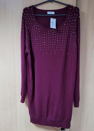Тонкий длинный свитер большого размера, рукав реглан,темно бордовый,декор железные камешки.Ог 116+, низ 100+, рукав от ворота 77, длина 86.