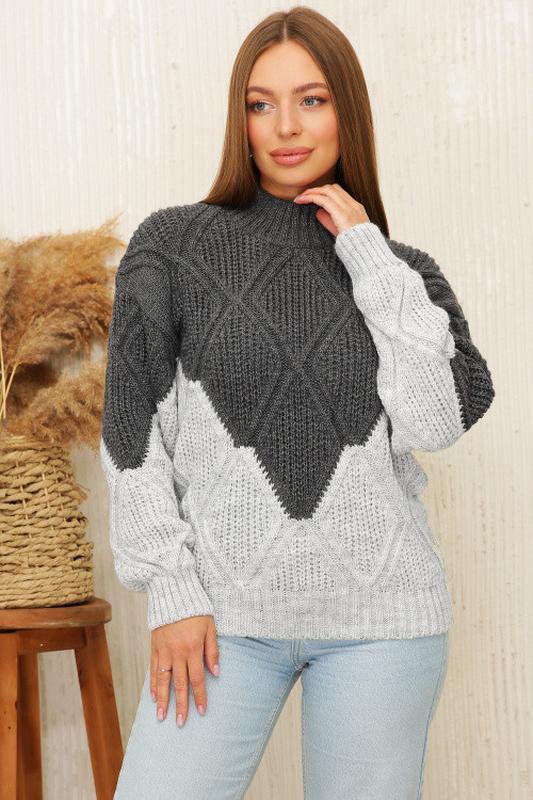Вязаный женский свитер. Размер универсальный 44-50. Состав - 50% шерсть 50% акрил. Рост модели на фото 168 см, размер 44. Удобный стильный свитер, воротник стойка, красивые элементы вязки. Идеальный выбор в холодную пору года.