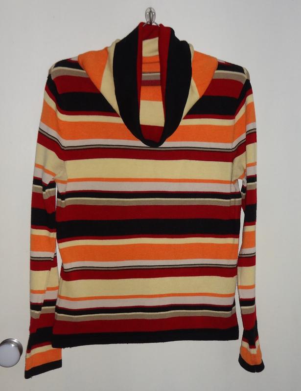 смугастий веселий светр, розмір 46 В ідеальному стані без дефектів. Високий комір-хомут дозволяє по-різному його драпірувати - спускати на груди, або повертати в кілька шарів на шиї, замінюючи шарф. М'який трикотаж – тканина, дуже приємна у дотику – гіпоалергенна, не колюча. Груди 48 см, ПОТалії 42 см, ПОБЕДЕР 45 см, довжина 62 см, довжина рукава 65 см. висота коміра 21 см. Пересилання Україною Укрпоштою, Новою Поштою згідно тарифів перевізника. Передплата на картку Приватбанку. Товар не підлягає поверненню.
