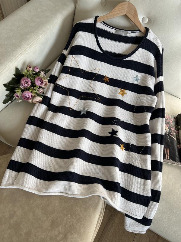 Светр в смужку бренду C&A Canda Premium Зручний, крій оверсайз, ідеально сидить по фігурі. Розмір по бірці S. Заміри: 1/2 ОГ 50-59 1/2 От 47-54 Довжина 72 Рукав 62 Плечі від шва до шва 57-53 *на жаль бірки зрізані, тому склад невідомий