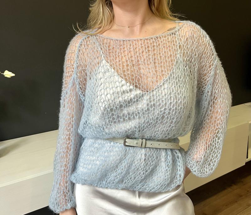 Свитер крупной вязки, 100% ручная работа, мягкий и легкий, размер универсальный подойдет на любой тип фигуры (на фото одет на параметры 86-70-96), состав нити: супер кид мхер 70%, полиамид 30%. Также в наличии в белом, черном, высоко-розовом, сером цветах. В шоу-румах такие продаются в два раза дороже.