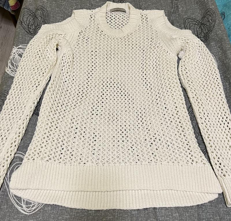 Свитер с открытыми плечами, цвет молочный ног-45 см; длина по спинке-63, длина перед- 58 см; рукав-63 см
