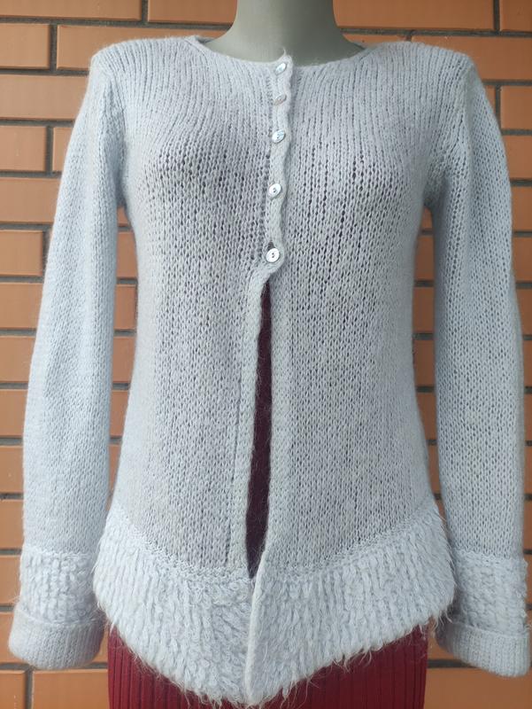 Стильный кардиган светло серого цвета. 30%мохер. Пряжа очень мягкая, приятная на ощупь, немножко тянется. Спинка чуточку длиннее, скругленный низ. Стан - идеальный Размер около 42/44 длина 61/64 ОГ 92 ОТ 86 плечи 38 рукав 61